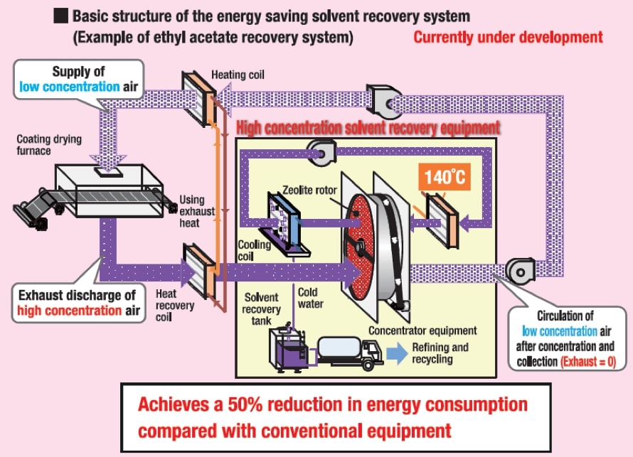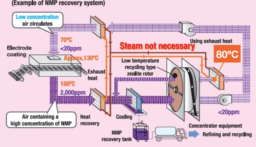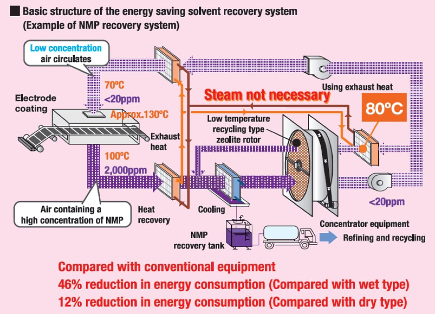This system is a dry type solvent recovery system embedded into our Takasago-developed heat recovery system, which realizes industry-leading energy saving. We propose the optimum recovery system according to the type of solvents, from a high boiling point NMP for use in battery plants, to a low boiling ethyl acetate for use in printing factories.