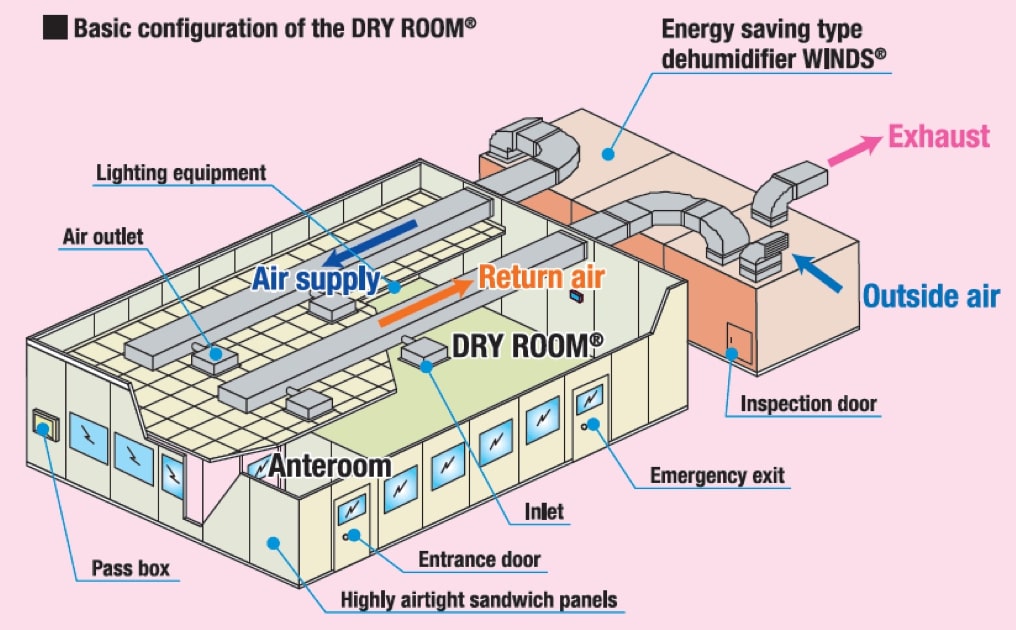Moister in the air is an impediment to yield improvements in the manufacturing processes for the increasing production of rechargeable lithium-ion batteries and organic EL. This manufacturing is therefore performed in a Dry Room© which has the moisture in the air removed in a controlled low dew point atmosphere.